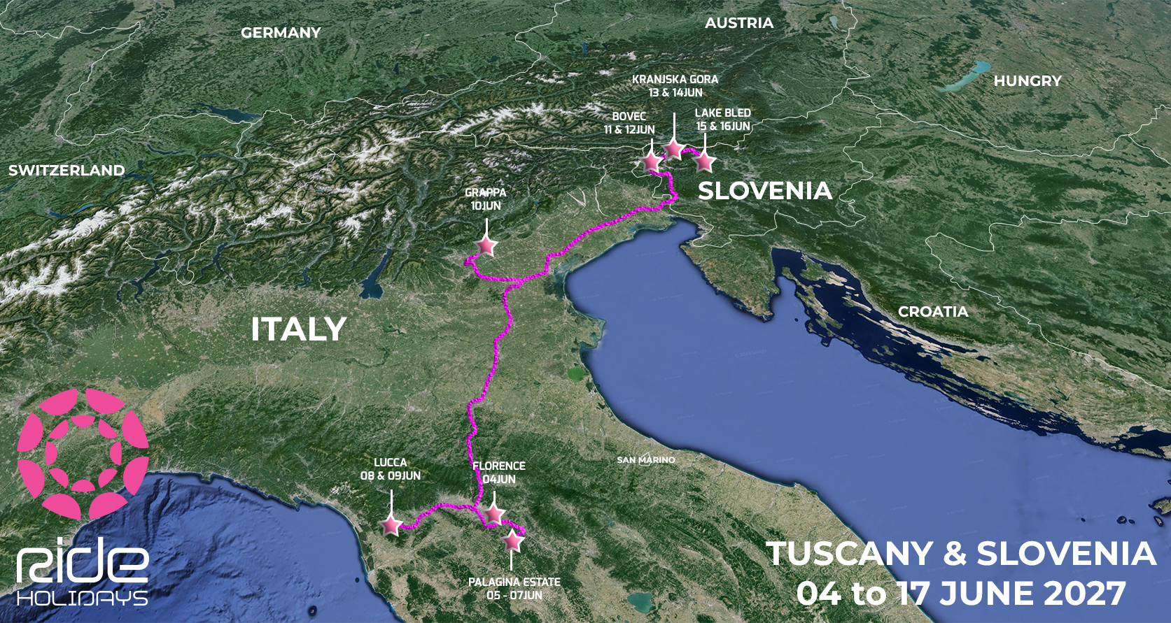 04 to 17 June 2027, 14 days / 13 nightsStarting in Florence and finishing at the stunning Lake Bled. That’s a combination that’s sure to be popular. The first week is exploring beautiful Tuscan towns, culture, white roads and amazing food. The last week is spent in the Slovenian mountains. You’ll ride climbs that made Tadej Pogačar one of the world’s best cyclists. The perfect trip that covers all bases. Non-riders (Team Macchiato) are very welcome and will be well looked after. Like all RH trips you will have a separate program and guide. UNESCO towns, vineyards, markets and gardens - they all await. It’s a good idea to be fit though as we’ll arrange a good walk each day for those wanting some exercise. Cyclists are welcome to join Team Mac on the odd day off. Katrina Mills will be your guide. Ride Holidays cycle tours are achievable for anyone who rides a road bike, not just the serious cyclist. There are 2-3 rides to choose from daily. Cappuccino, Latte and Espresso. Ranging from 60km and well into the triple digits. The RH team will be a combination of familiar faces like Robyn Marchant and Dean Mills. We’ll also have some local guides. That’s important as we explore their backyard. Please consider joining us on what will be an epic trip. Look forward to seeing you in Florence. |